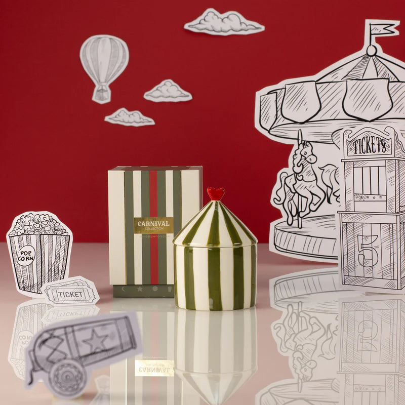 Housed in a striped ceramic vessel inspired by a classic circus tent, this candle with a lid brings playful charm with stylish olive green stripes that elevate any space.