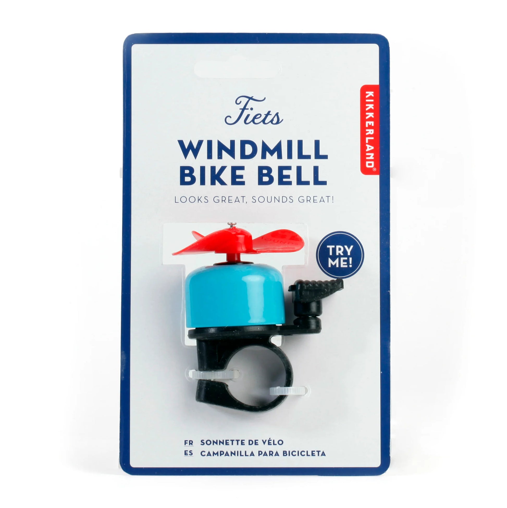 Classic metal bike bell with windmill attached. The spring-powered bell lever ensures a loud, crisp ring every time. Fits handlebars with 0.88” – 1.25” (22-33mm) diameter.