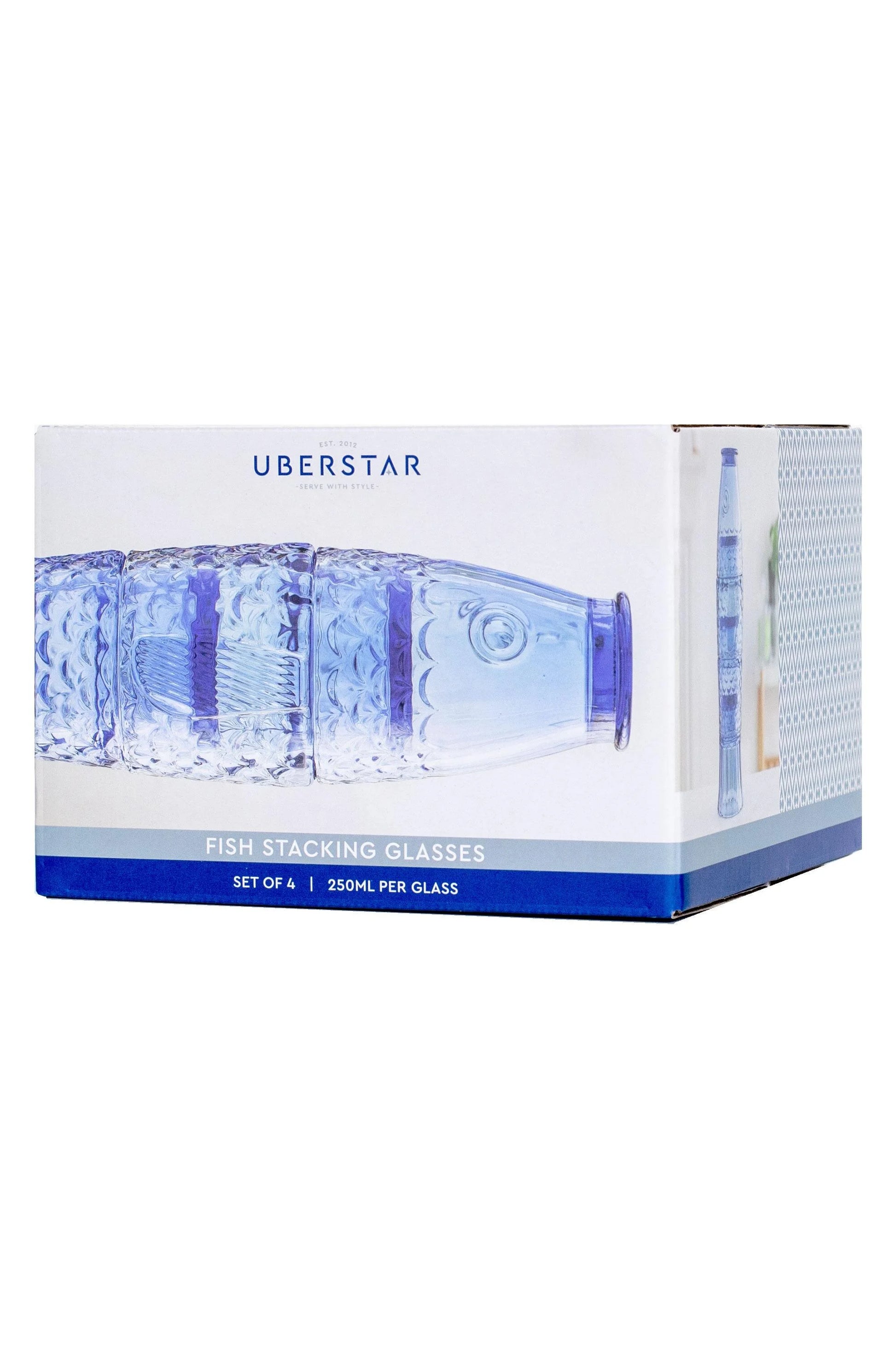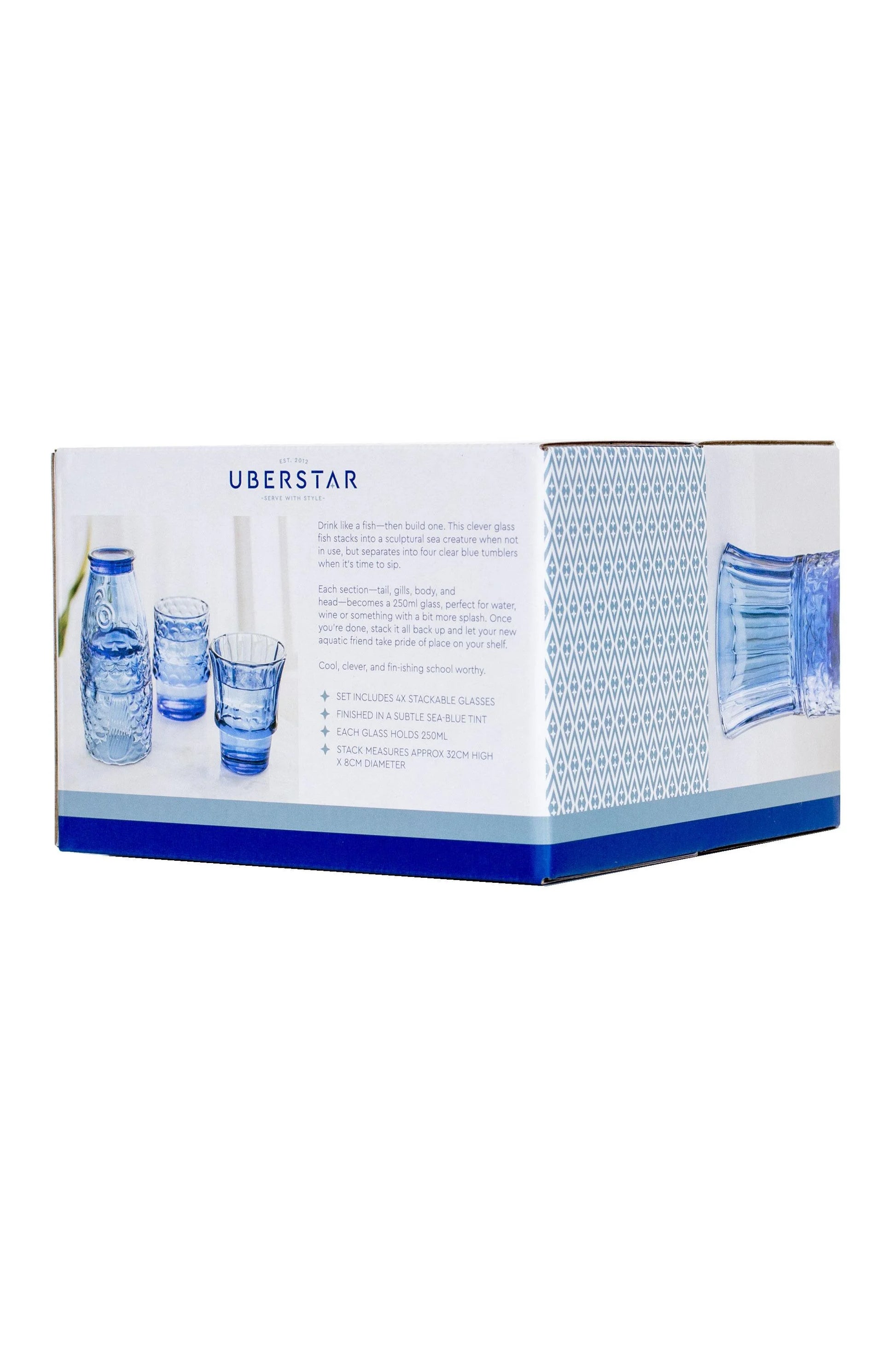 Beautiful fish stacking glass set in blue tint, with four individually shaped 250ml glass tumblers.