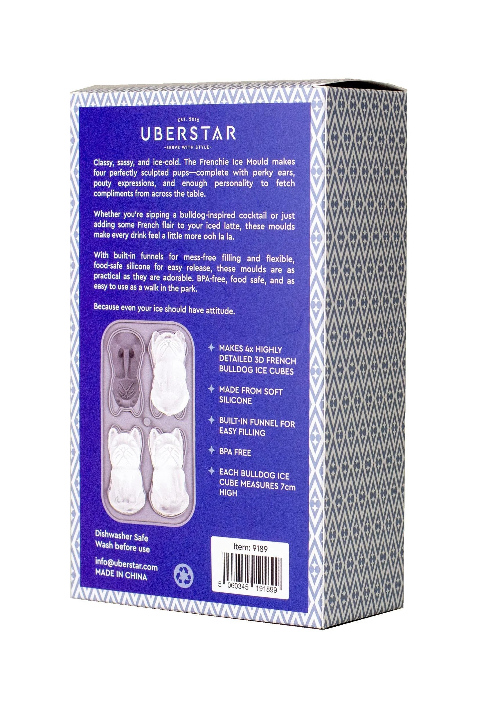 Each French Bulldog ice cube measures 7cm x 5cm
