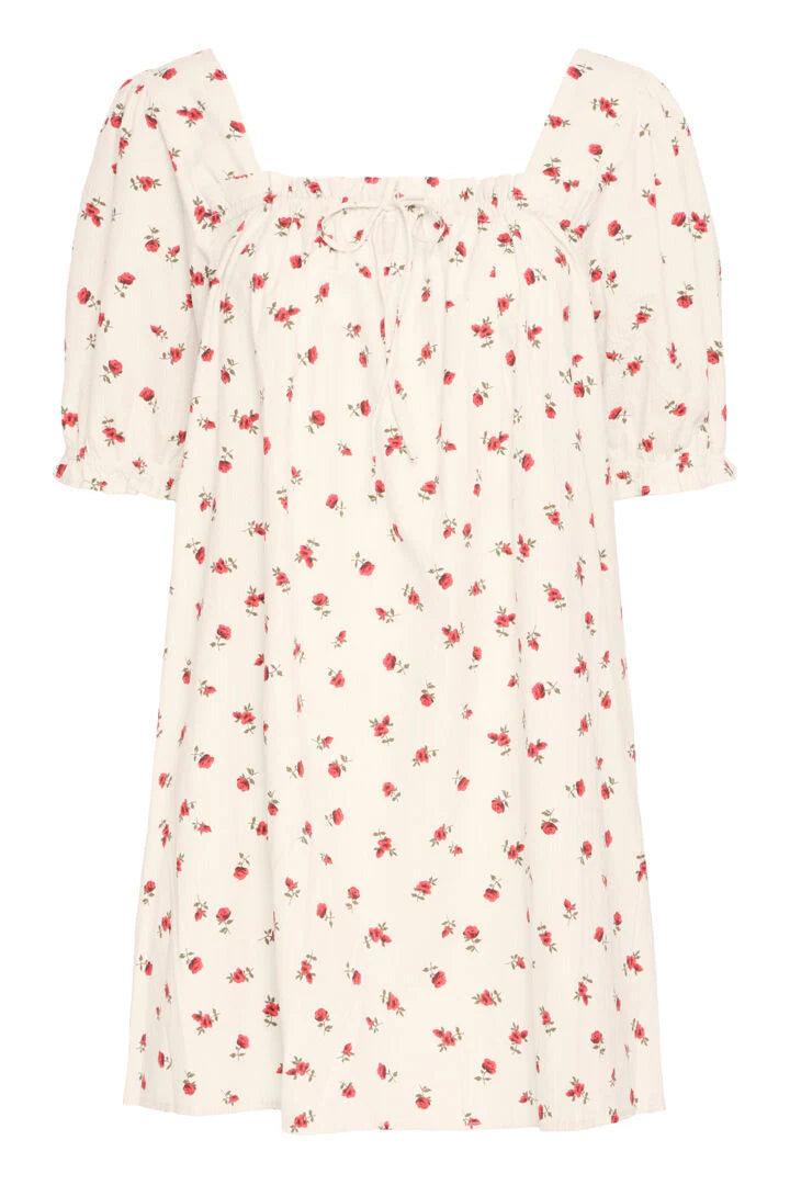 ICHI presents this short length rosey dress with a sweetheart cut to finish.