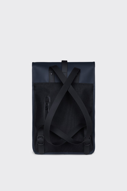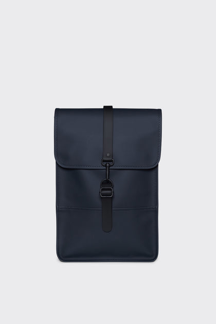 Backpack Mini is a downscaled version of Backpack, a true Rains classic. The silhouette is characterized by its prominent flap and central strap with carabiner closure. This clean and ever contemporary waterproof rucksack features an internal laptop pocket, a main compartment, and a concealed external phone pocket on the back panel.