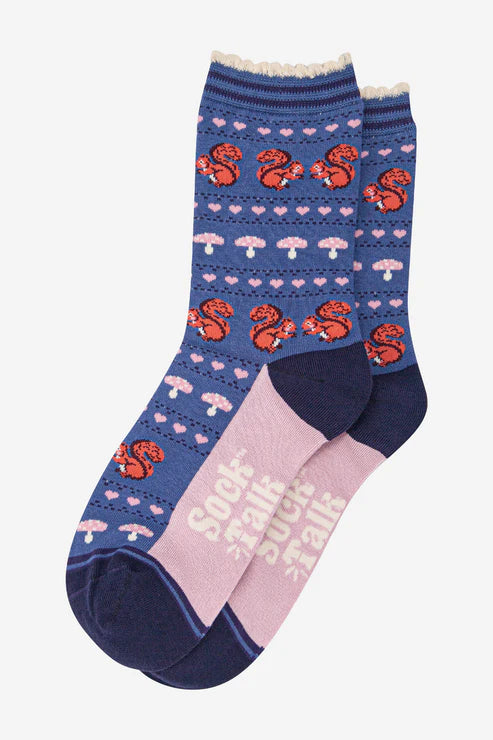 Fair Isle inspired ankle socks featuring red squirrels, toadstools and love hearts. These beautiful socks are made from soft, sustainable bamboo. Breathable and gentle on the skin, these delightful socks are finished with a luxuriously comfortable scalloped cuff.